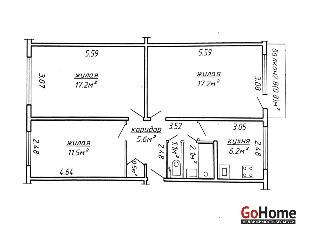 Общая площадь квартиры составляет 61.4м2 (по СНБ 62.2м2). Жилая 45.9м2 состоит из трёх изолированных комнат, выходящих на разные стороны дома. Уютная кухня 6.2м2. Санузел раздельный. Высота потолков 2.51м. Есть застекленный балкон 2.8м2. Квартира расположена на 5 этаже 5 этажного панельного дома (1970 г.).