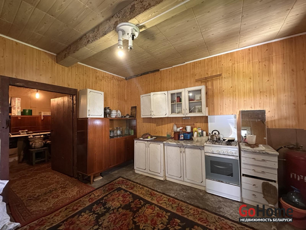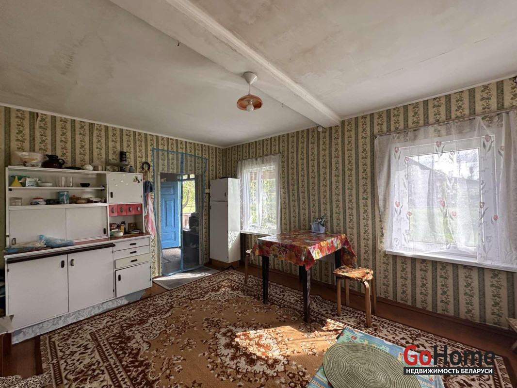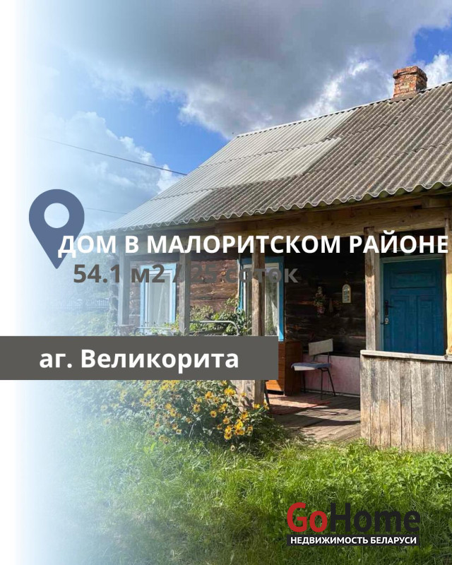 Продаётся жилой дом в агрогородке Великорита Малоритского района. Общая площадь дома составляет 54,1 квадратных метра, из которых жилая площадь — 29,9 квадратных метров, а кухня — 13,9 квадратных метров. Дом построен в 1950 году, имеет деревянный фундамент и стены из строительного бруса, крыша покрыта шифером. Коммуникации включают централизованное электричество, газ - баллон (централизованный газ проходит рядом с границей участка), печное отопление и водоснабжение от пробитой скважины с установленным гидрофором; на участке также имеется колодец.