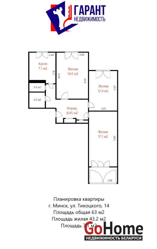 Общая площадь - 63 м2,