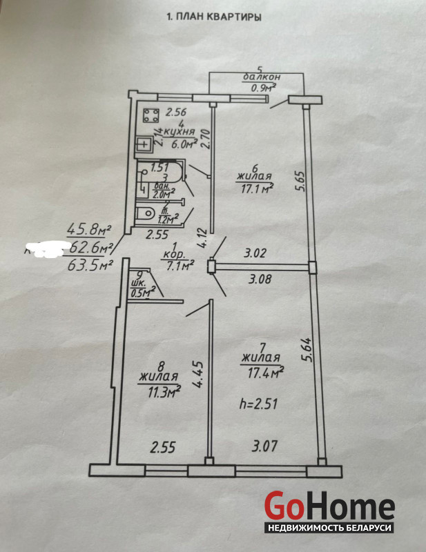 Общая площадь 63,5 м², жилая 45,8 м², кухня 6,0 м². Расположенная на 5-м последнем этаже, она предлагает потрясающий вид и тишину. Все окна — ПВХ, кроме одного между комнатой и балконом, что добавляет особый уют.