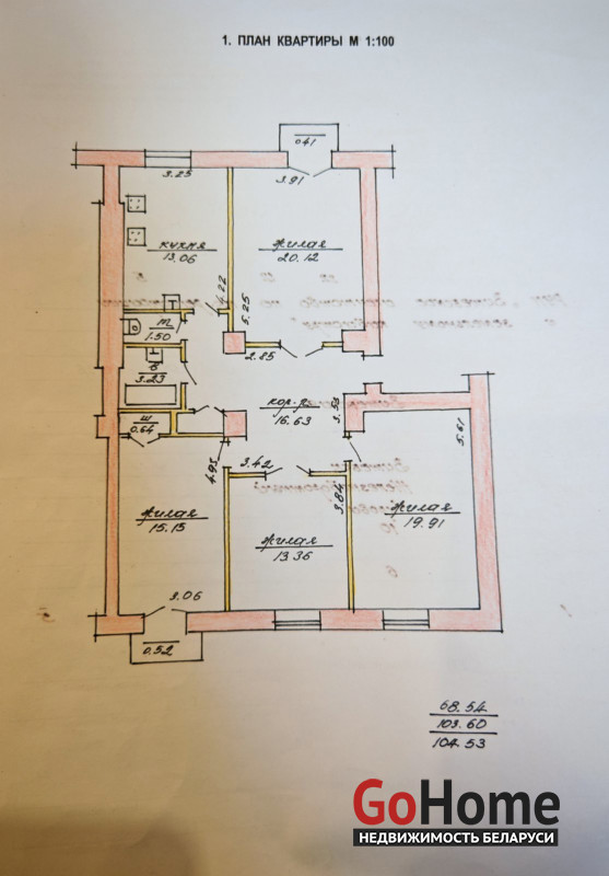 Общая площадь квартиры 104.53м2, жилая 68.54м2, кухня 13.06 м2.