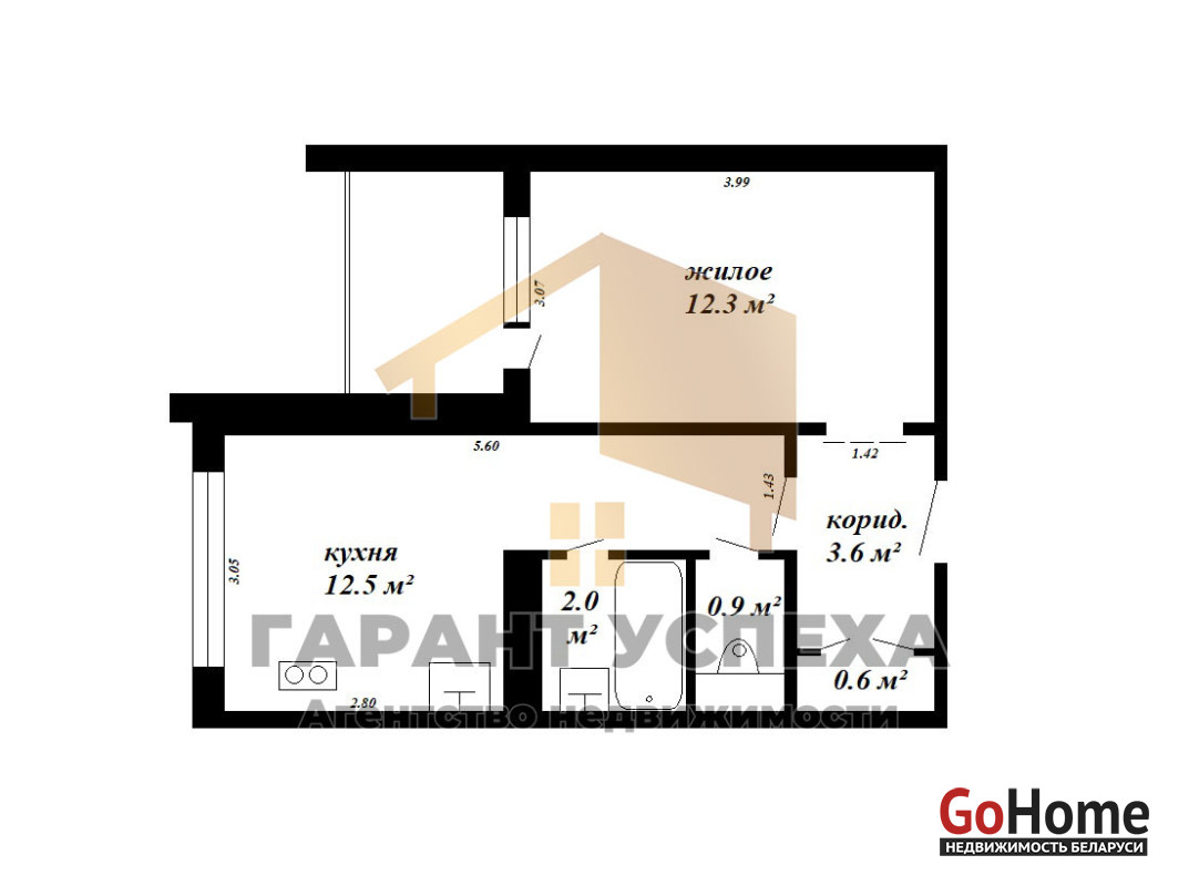 Общая площадь квартиры составляет 31,9 м² (по СНБ - 33,9 м²), жилая - 12,3 м², кухня - 12.5 м². Санузел раздельный.