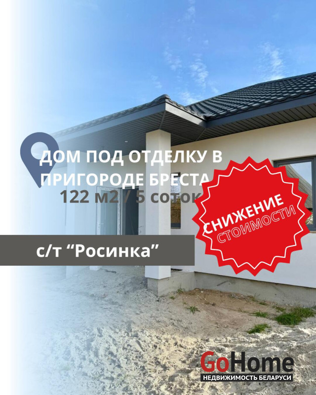 Подписывайтесь на наш instagram @ecrzby для удобного слежения за новыми актуальными объектами.В продаже современный жилой дом 2025 года постройки в СТ "Росинка" (в направлении Каменицы-Жировецкой). Общая площадь участка 0.0503га. Дом имеет бетонный монолитный фундамент, стены из газосиликатных блоков (300 мм), утеплены пенополистиролом (50 мм), на них нанесена камешковая декоративная штукатурка, кровля – металлочерепица. Окна ПВХ с тройным остеклением и входная дверь ПВХ. Общая площадь дома - 122 кв.м. Высота потолка 3м. Включает: кухню-гостиную, площадью 46,35 м2, с выходом на крытую террасу общей площадью 15 м2. Также в доме имеется три жилых комнаты 13 м2 + 13 м2,и одна (15.4 м2) представляет собой мастер-спальню с собственным санузлом 3.5 м2 и гардеробной 2.9 м2. Санузел (5.33 м2), топочная (9 м2). Есть место для стиральной машины и дополнительный туалет, лестница на просторный чердак. Стены в доме оштукатурены, электропроводка сантехника разведена. Коммуникации: Электроснабжение есть Газоснабжение – централизованное Водоснабжение – скважина с насосом Гидрофор Канализация – местная (две переливных ёмкости) Интернет – оптоволокно от Белтелекома (по улице). Участок огорожен с трёх сторон забором. До остановки общественного транспорта 300 м, рядом есть магазин.