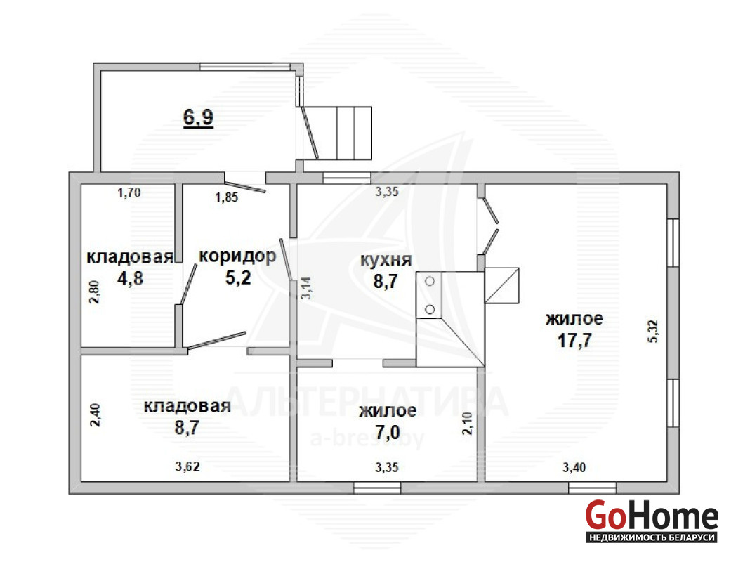 Жилой дом в Жабинковском р-не. 2020 г.п. 1 этаж. Общ.СНБ - 59,0 кв.м, общ.- 52,1 кв.м, жил.- 24,7 кв.м, кух.- 8,7 кв.м. 2 комнаты.
