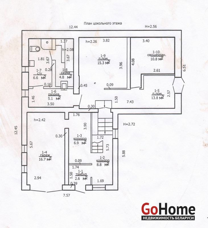 - 1 уровень – цоколь. Находятся: гараж, овощехранилище, сауна, сан.узел и котельная.
