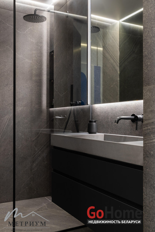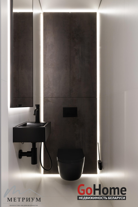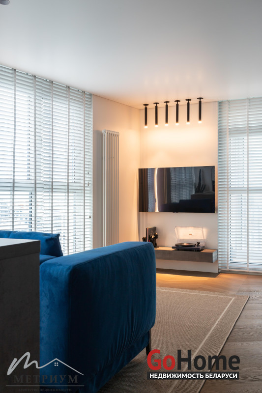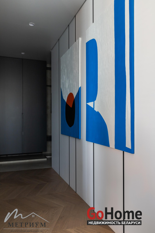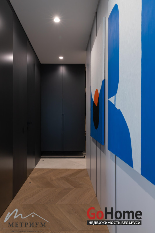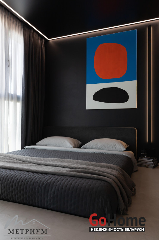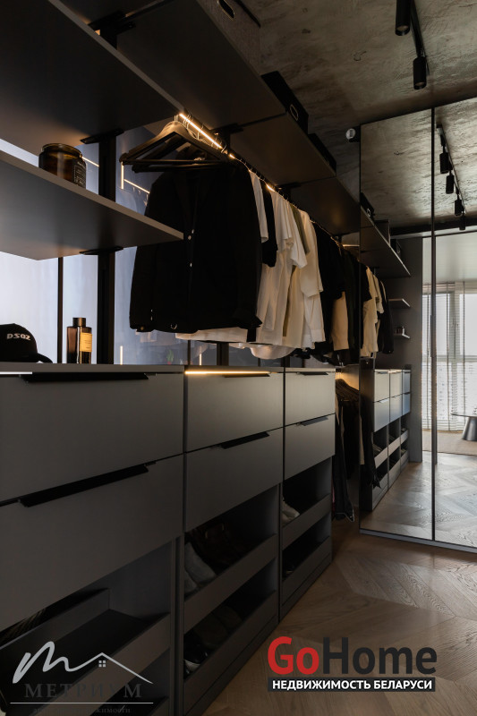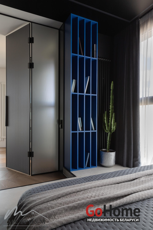 В спальной комнате выполнена шумоизоляция потолка и стен, шторы с электроприводом. Просторная вместительная гардеробная на две стороны. Скрытый вход в спальную.