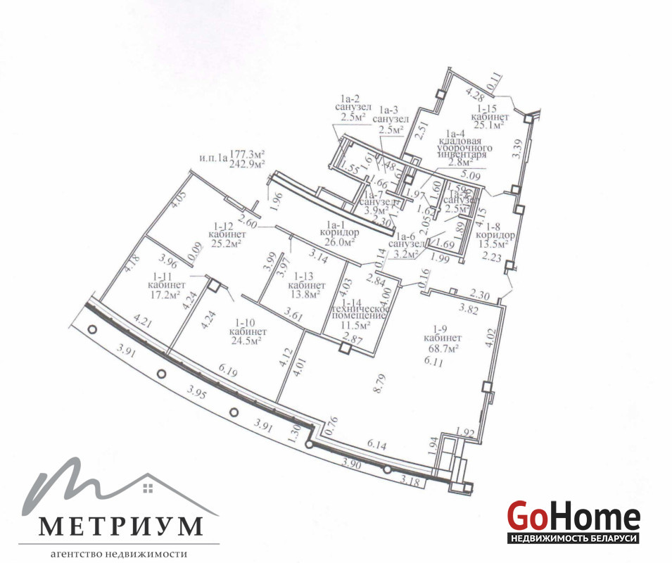 Общая площадь пространства 242,9 кв.м. на 1 этаже, с возможностью грамотного зонирования, в сочетании Open Space и отдельных кабинетов.Индивидуальная группа раздельных сан узлов.