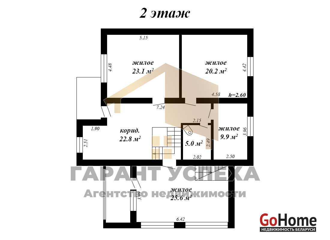 Общая площадь – 268/192 кв. м, жилая – 25,6 кв. Пять изолированных жилых комнат и летняя комната на мансарде.