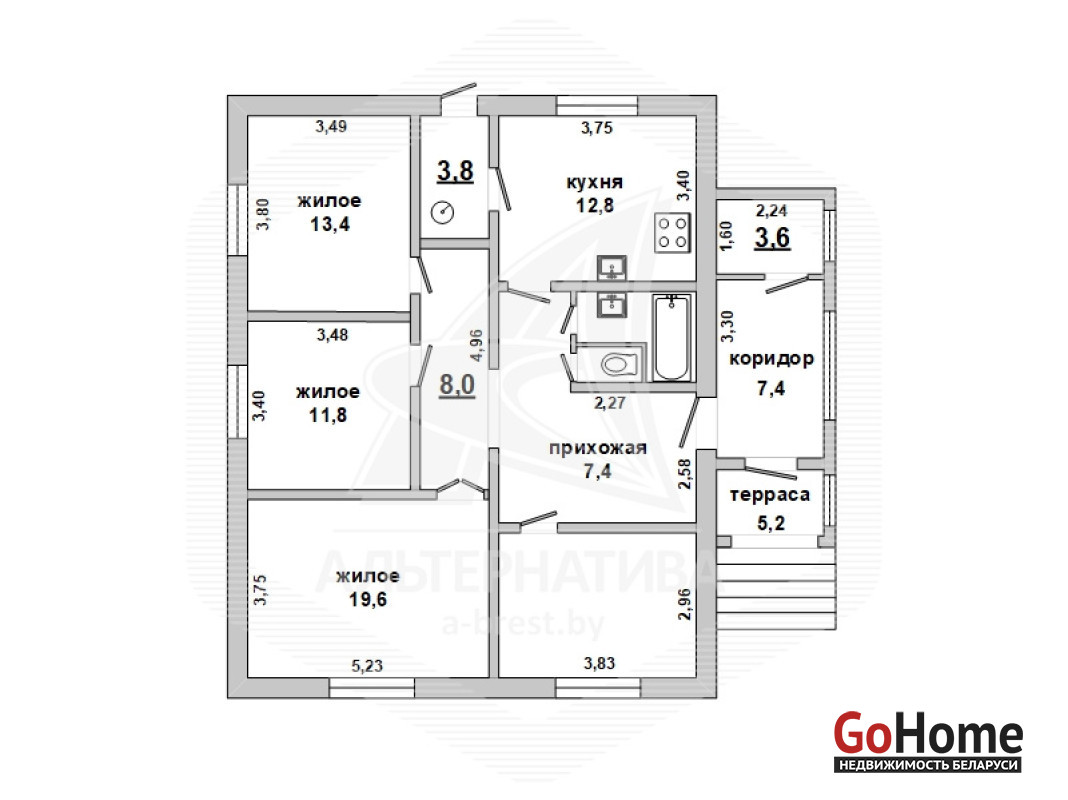 Жилой дом в г.Каменце. 1 этаж. Общ.СНБ - 142,9 кв.м, общ.- 98,1 кв.м, жил.- 56,1 кв.м, 4 комнаты, высота потолка - 2,60 м.