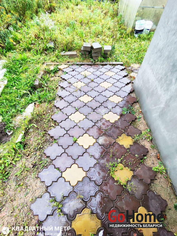 · газон, туи, плодовые деревья. Тротуарная плитка