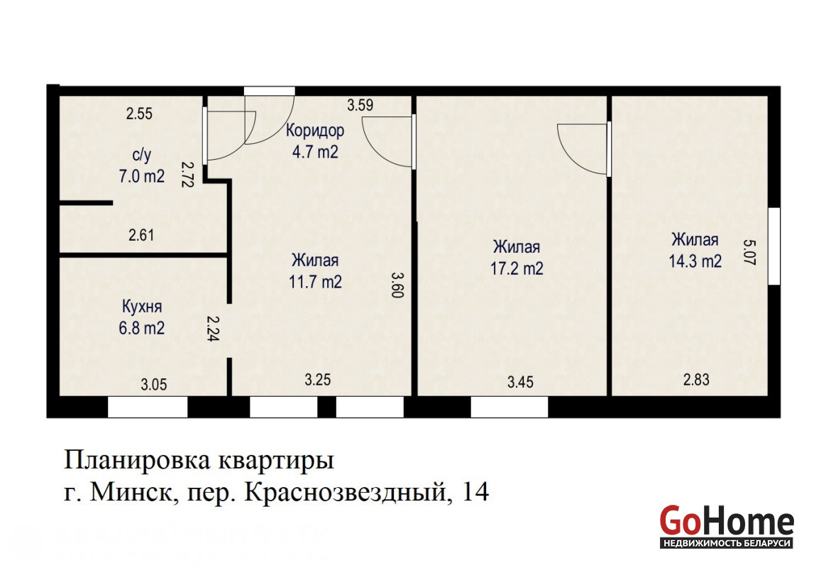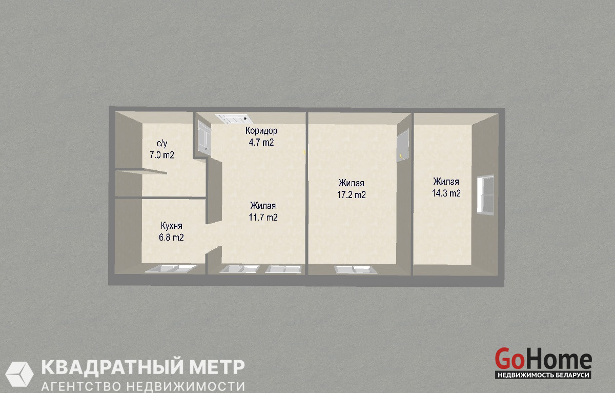 • Простор и планировка: Общая площадь 61.7 м2, жилая — 43.2 м2. Большие комнаты, высокие потолки — здесь легко дышится и комфортно живётся.