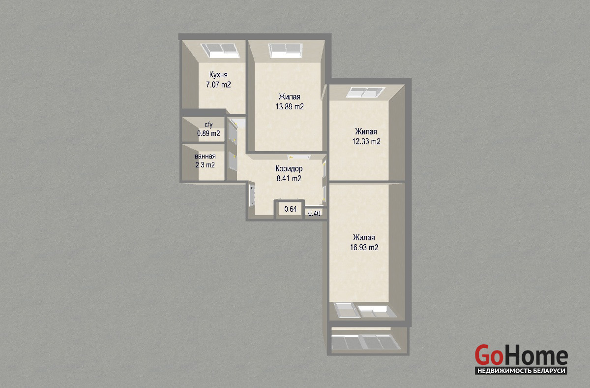 - Жилые раздельные комнаты 16,93 кв.м., 13,89 кв.м., 12,33 кв.м.