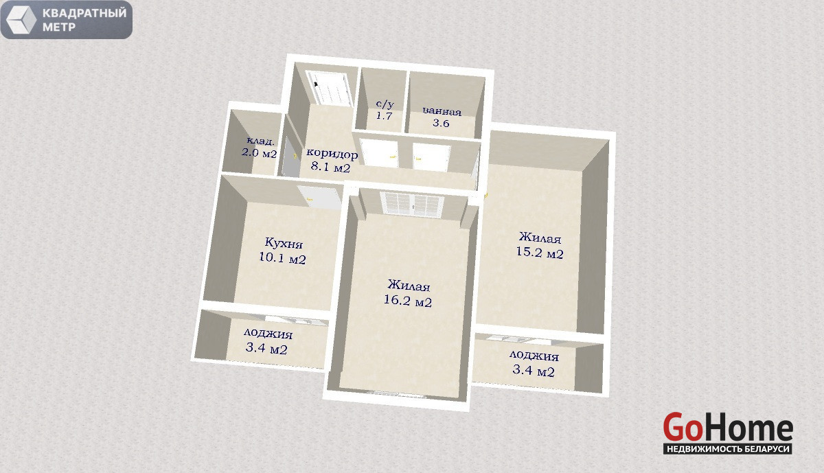 Вторая комната: Уютное пространство, выкрашенное в белый и светло-серый. Выход на лоджию. Идеально для 1-2х рабочих мест. Потенциал: Можно переделать под свои нужды и расширить до желаемых размеров.