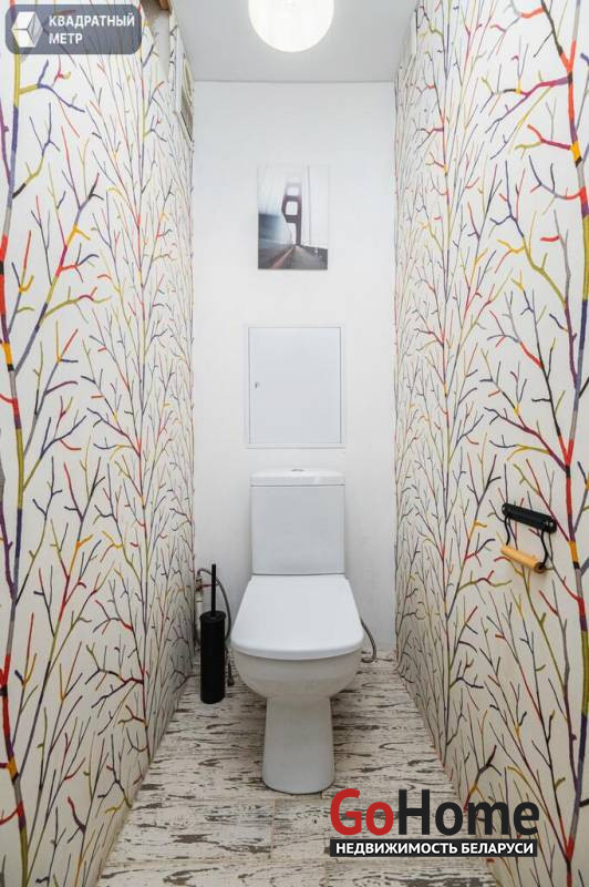Туалетная комната: Просторная. Антискользящая плитка на полу. Обои на стенах. Натяжной потолок. Небольшой, но вместительный антресоль в стене.
