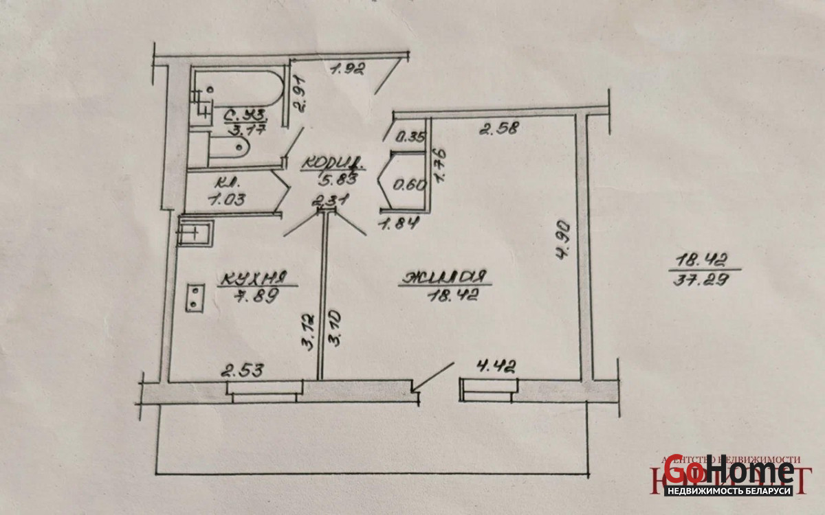 Общей площадью 37.29м2, жилая 18.42 м2, кухня 7.89м2. С нишей.