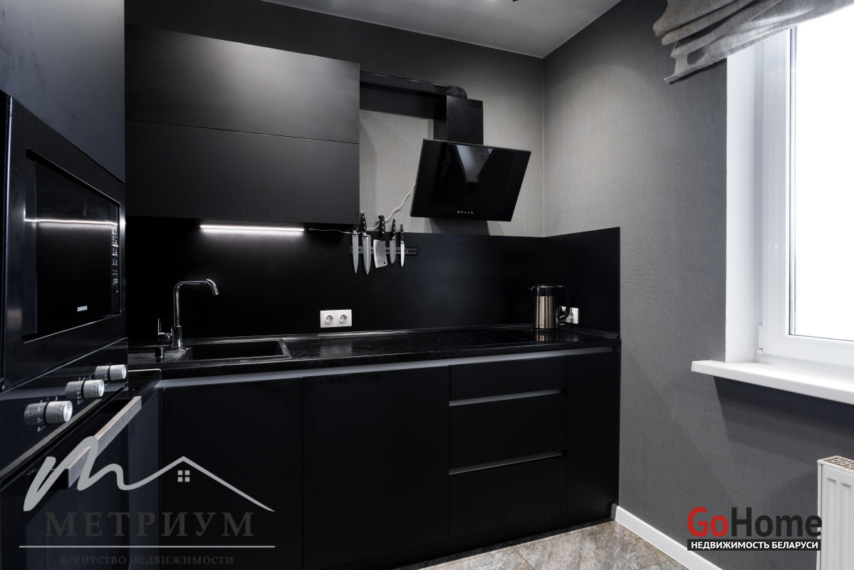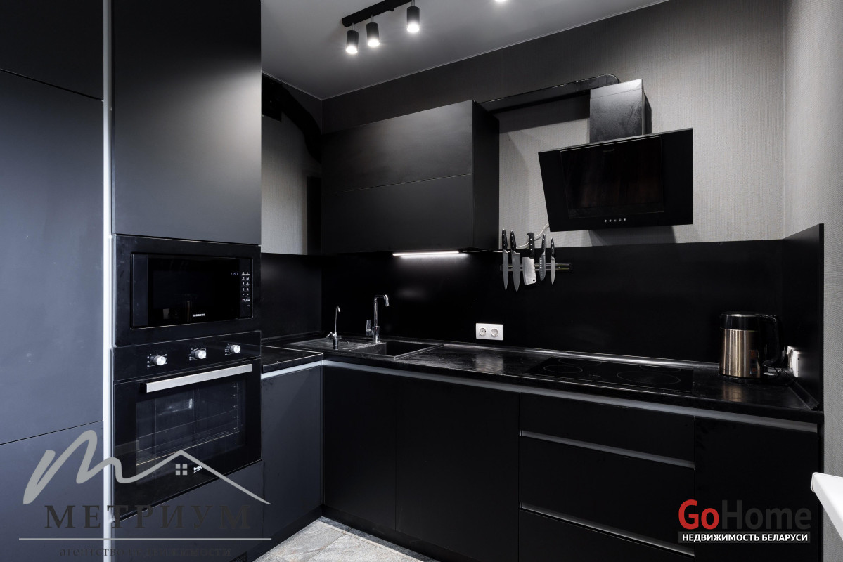 Кухня в нестандартной цветовой гамме укомплектована импортной техникой