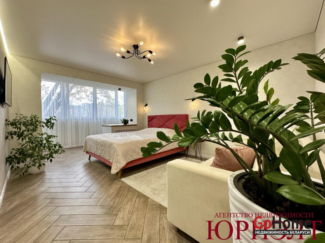 В квартире выполнен дизайнерский ремонт: стильный интерьер, натяжные потолки, качественные полы и плитка, установлен кондиционер. Огромная лоджия стала полноценной частью жилого пространства.