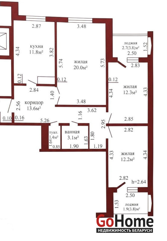 Общая площадь 74,4м2; жилая – 44,5м2; кухня - 11,8м2.