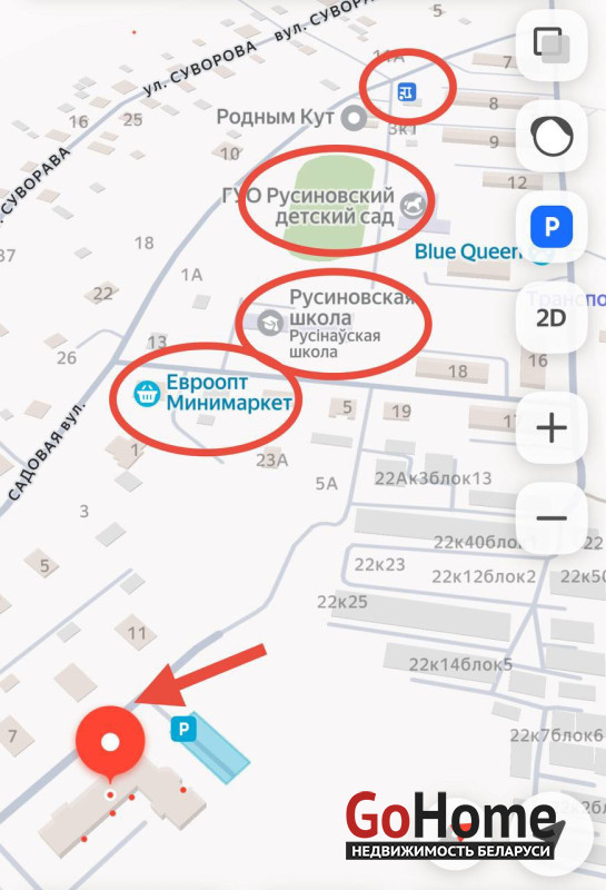 * В шаговой доступности продовольственный магазин ЕВРООПТ, почта, школа, детский сад, ЖД станция РУСИНО, автобусная остановка.