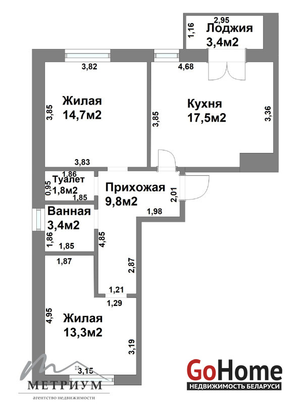 Площадь квартиры по СНБ 62.9 кв.м/ общая 60.5 кв.м./ жилая 28 кв.м./ кухня 17.5 кв.м.