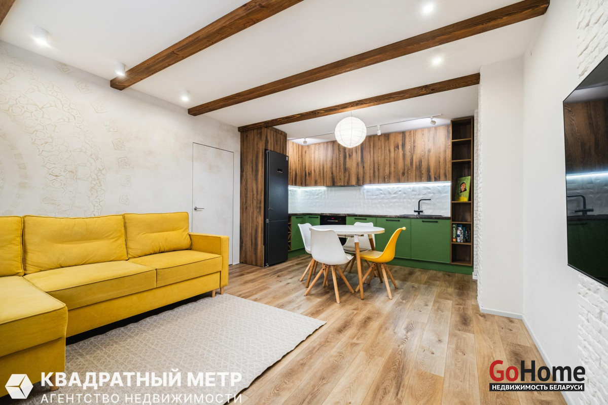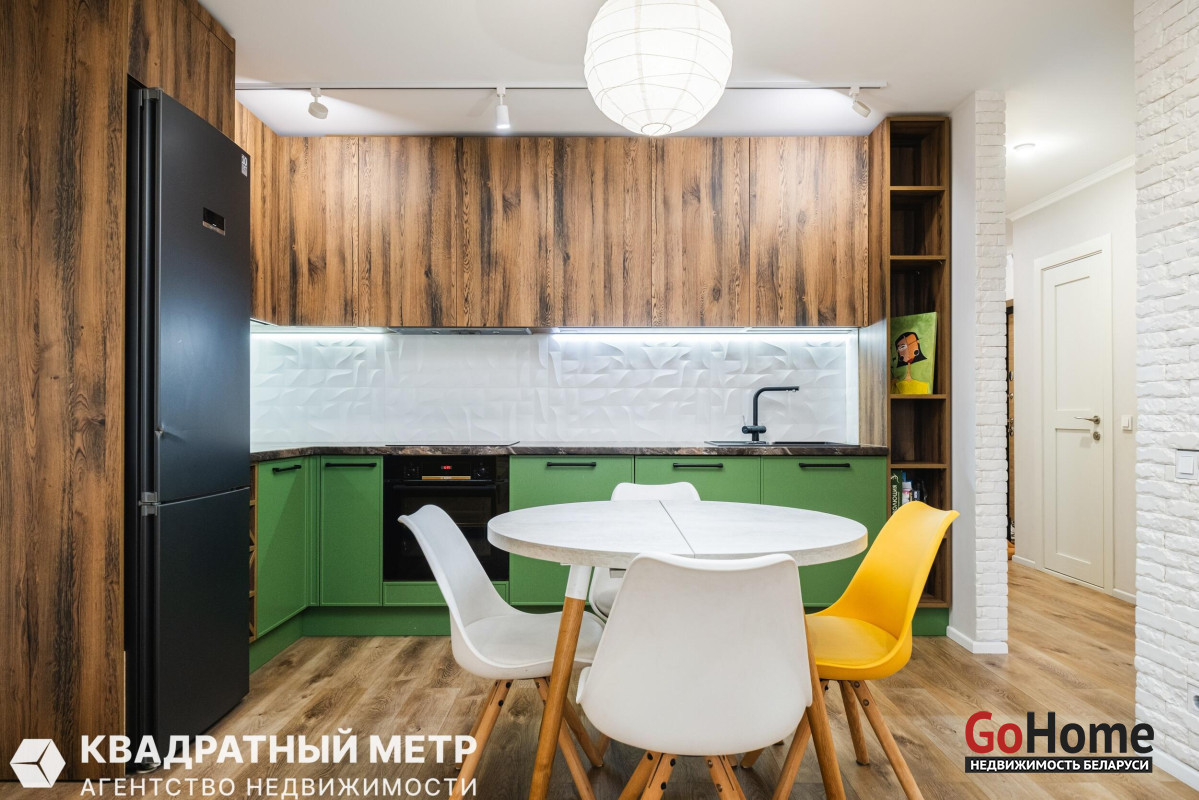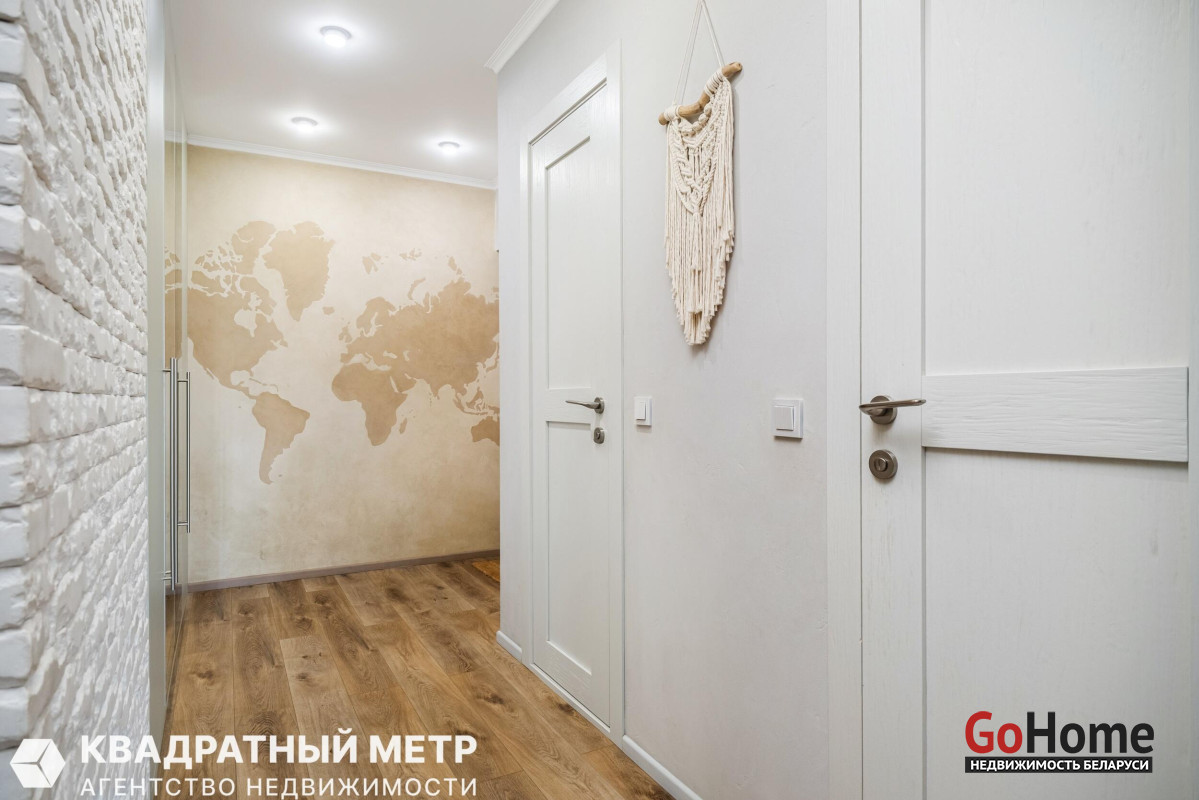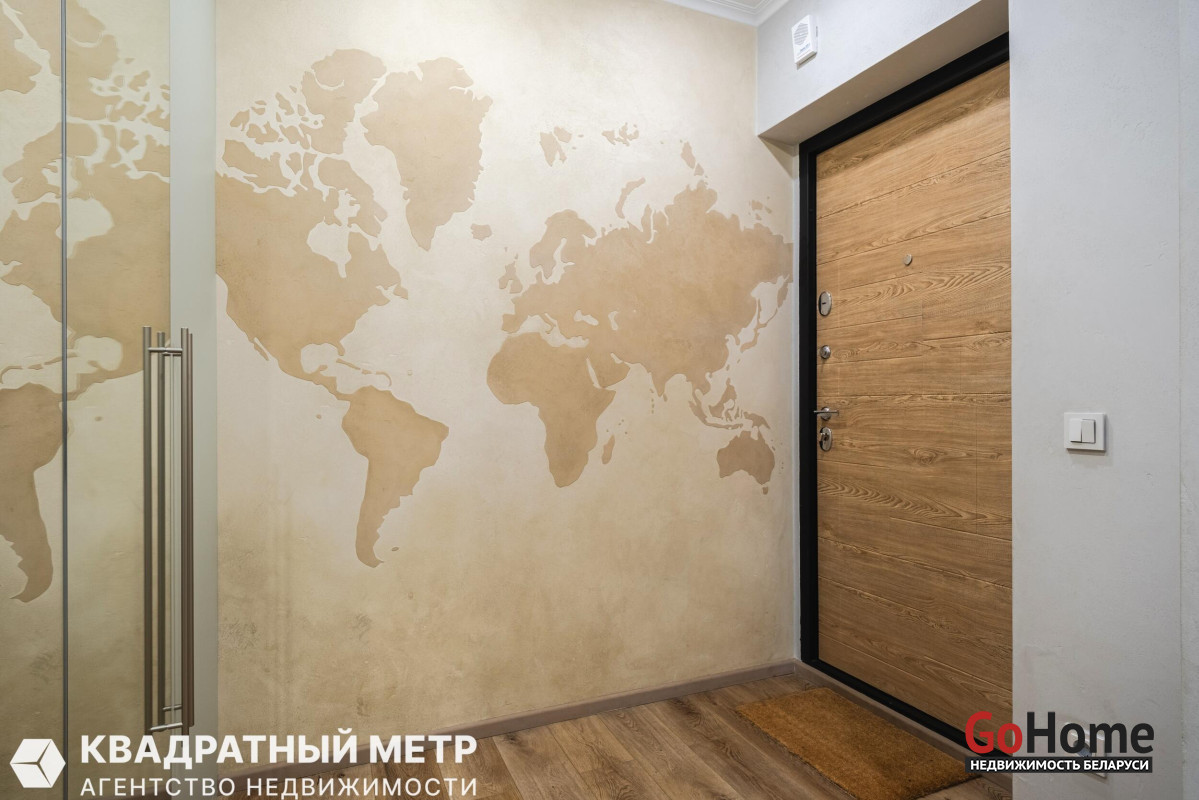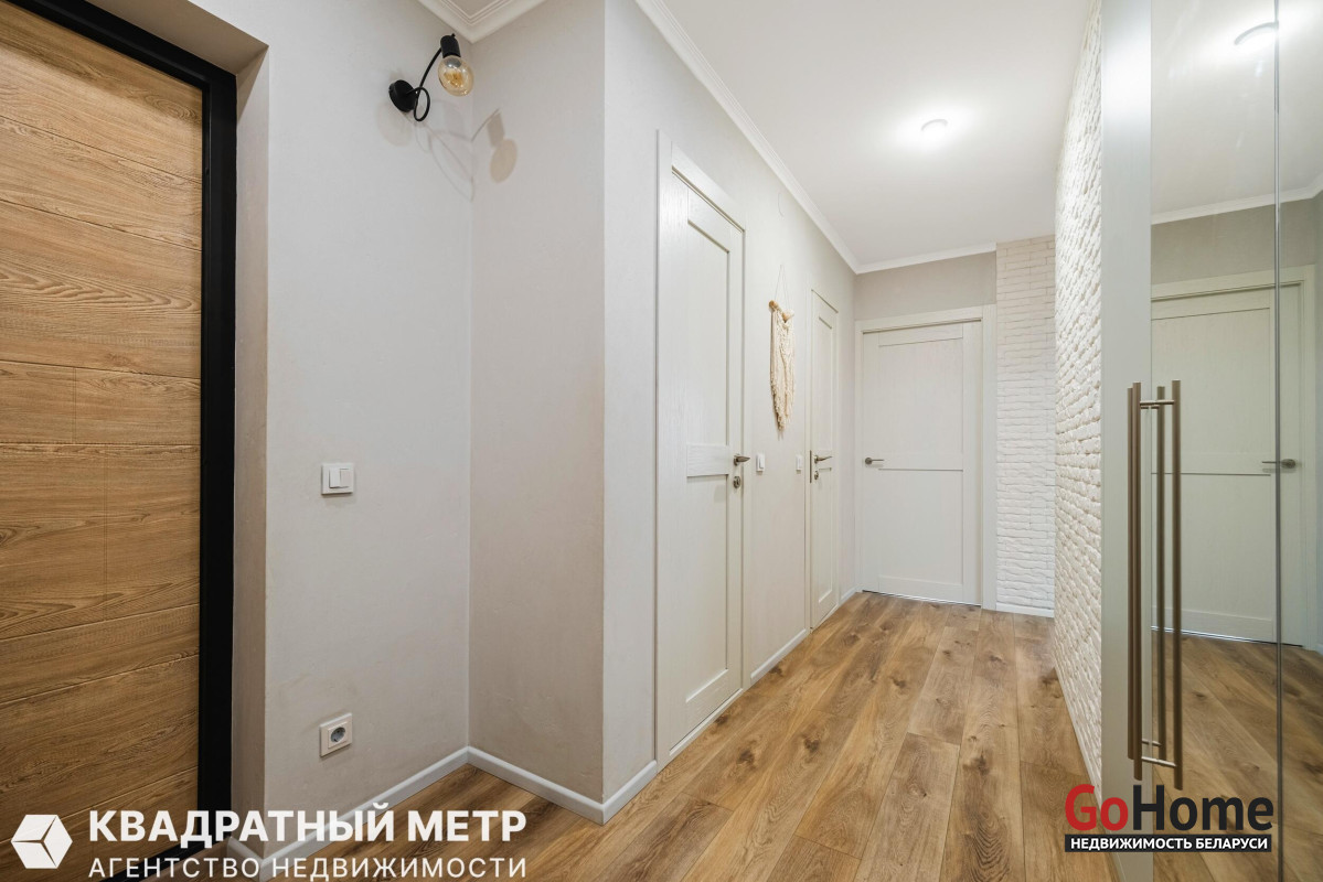 Дизайнерский ремонт с практичными материалами импортного производства, на полу-кварц винил и ламинат, на стенах декоративная штукатурка и обои, потолок — выровнен и окрашен, установлены межкомнатные двери из массива и скрытого монтажа.