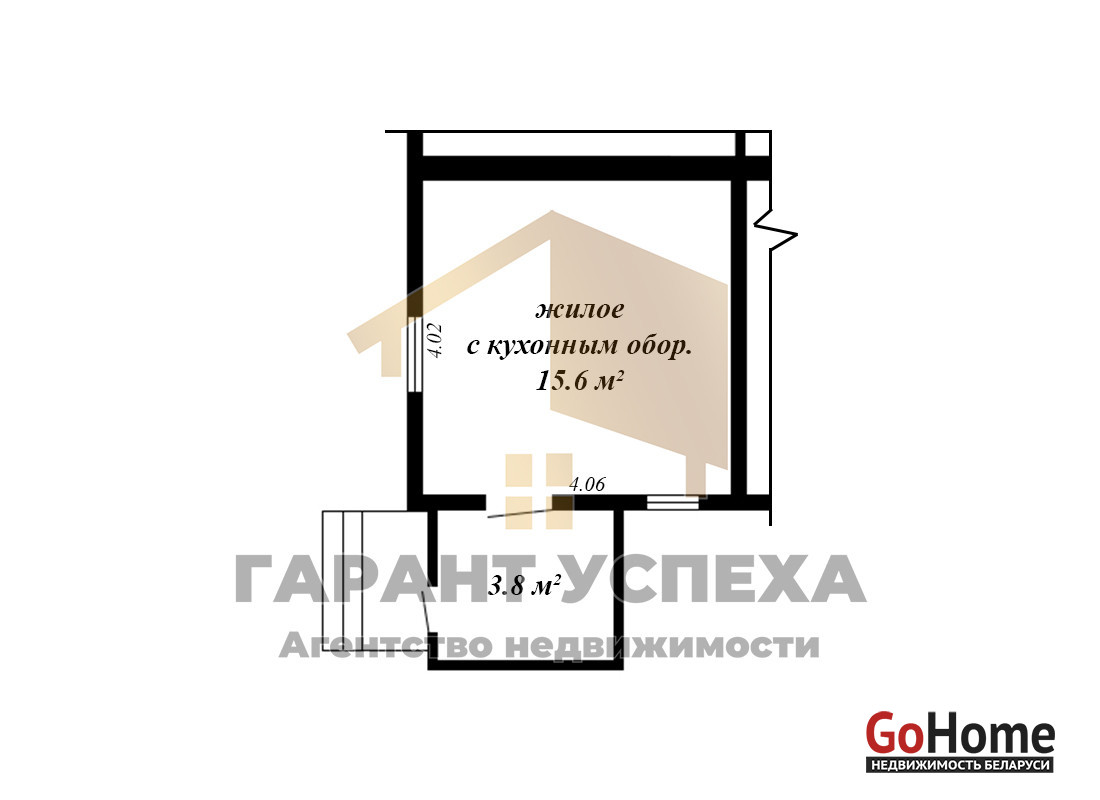 Общая площадь – 19,4 кв. м, жилая с кухонным оборудованием – 15,6 кв. м. Высота потолка – 2,5 м.