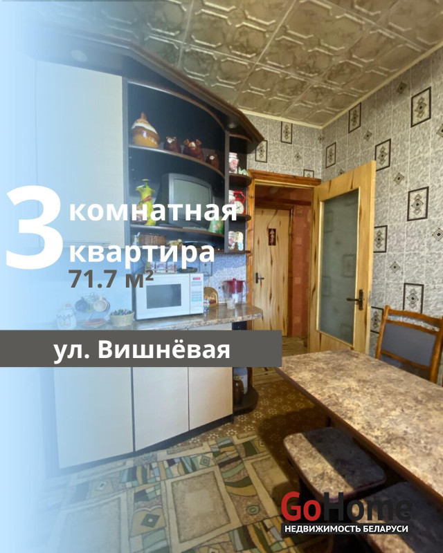 Подписывайтесь на наш instagram @ecrzby для удобного слежения за новыми актуальными объектами.Продается светлая и уютная 3-комнатная квартира на ул. Вишнёвая, расположенная в панельном доме 1992 года постройки. Квартира находится на 5 этаже 9-этажного здания и имеет общую площадь 71,7 м2, из которых жилая площадь составляет 31,8 м2, а кухня — 9,3 м2. Санузел раздельный. Просторный коридор оснащен встроенными кладовыми, а также есть две застекленные лоджии с выходом из кухни и одной из комнат. Квартира находится в аккуратном жилом состоянии: окна оборудованы стеклопакетами, полы покрыты линолеумом, стены оформлены обоями, а потолки высотой 2,6 м окрашены и оформлены снежкой. Входная дверь металлическая, межкомнатные двери выполнены из дерева. На этаже расположена дополнительная кладовая, также имеется пассажирский лифт. Чистый и аккуратный подъезд создает приятное первое впечатление. Квартира расположена в тихом спальном районе, окна выходят на две стороны дома, что обеспечивает хорошее освещение. Дом находится вблизи центра города с удобным транспортным сообщением, а во дворе предусмотрена парковка для автомобилей. Это отличный вариант для комфортной жизни!