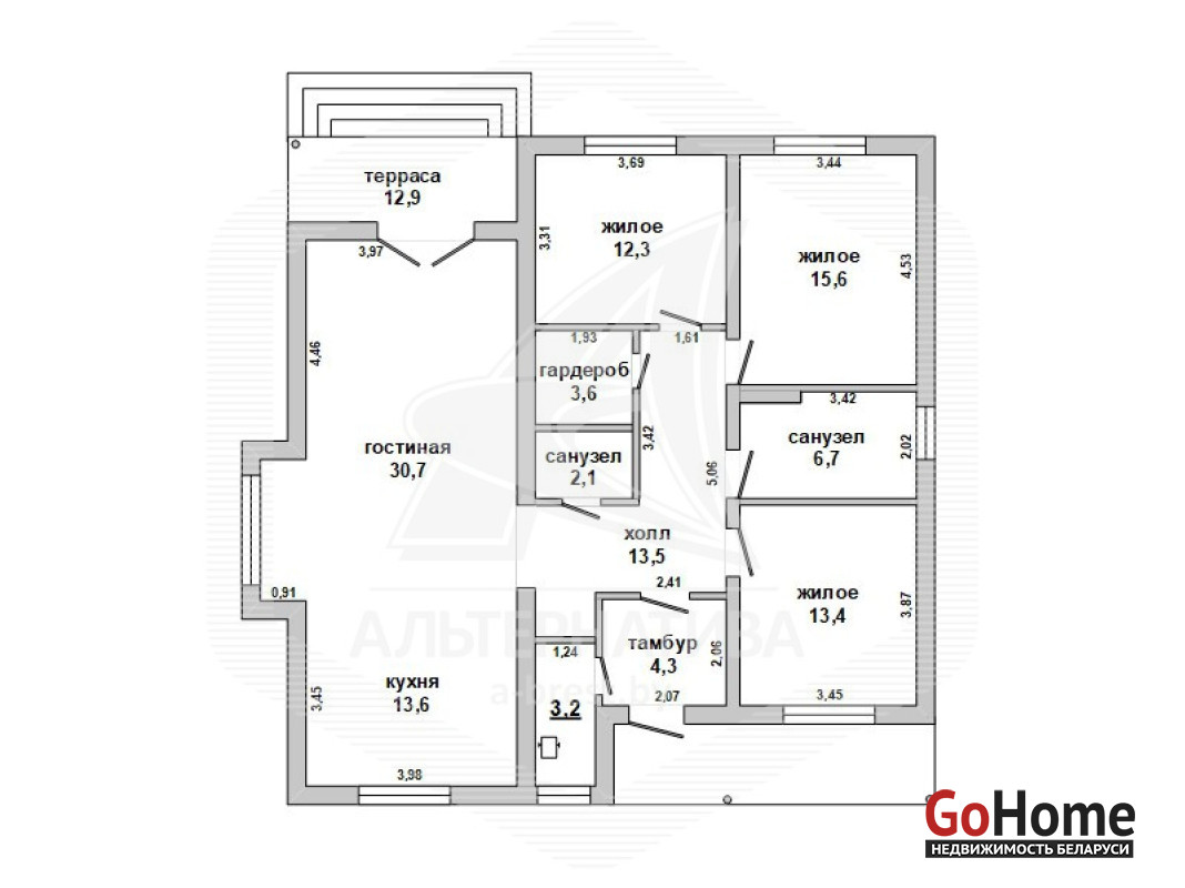 Жилой дом в Брестском р-не. 2021 г.п. 1 этаж. Общ.СНБ - 122,9 кв.м, общ.- 119,0 кв.м, жил.- 58,6 кв.м, кух.- 13,6 кв.м. 4 комнаты, высота потолка - 2,66 м.