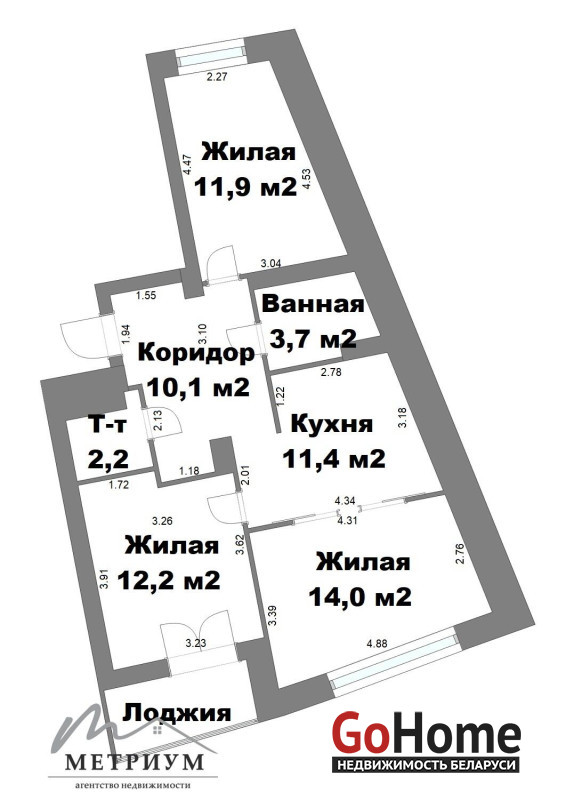 Общая площадь 65,5 кв.м (по СНБ 67,9 кв.м.) / жилая 38,1 кв.м. / кухня 11,4 кв.м.