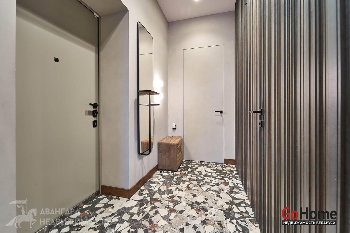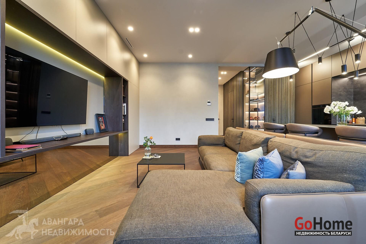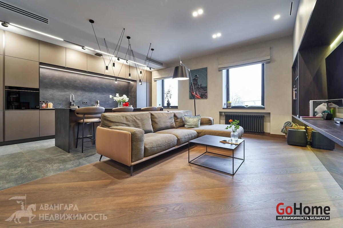 Площадь квартиры по СНБ 59,8 м2, жилая площадь составляет 49,2 м.2. В квартире был произведен полный демонтаж старого ремонта (потолки, стены, пол и коммуникации), была произведена замена всего от дверей, окон, до сантехники и электрики, даже потолочные перекрытия. В квартире установлена система «умный дом», приточно-вытяжная система вентиляции и кондиционирование. На полу паркетное покрытие, ремонт выполнен из дорогих и современных материалов. Перепланировка была узаконена.
