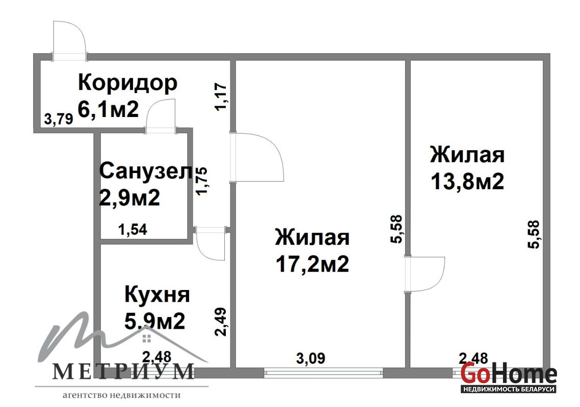 - гостиная 17,2 мкв, спальня 13,8 мкв