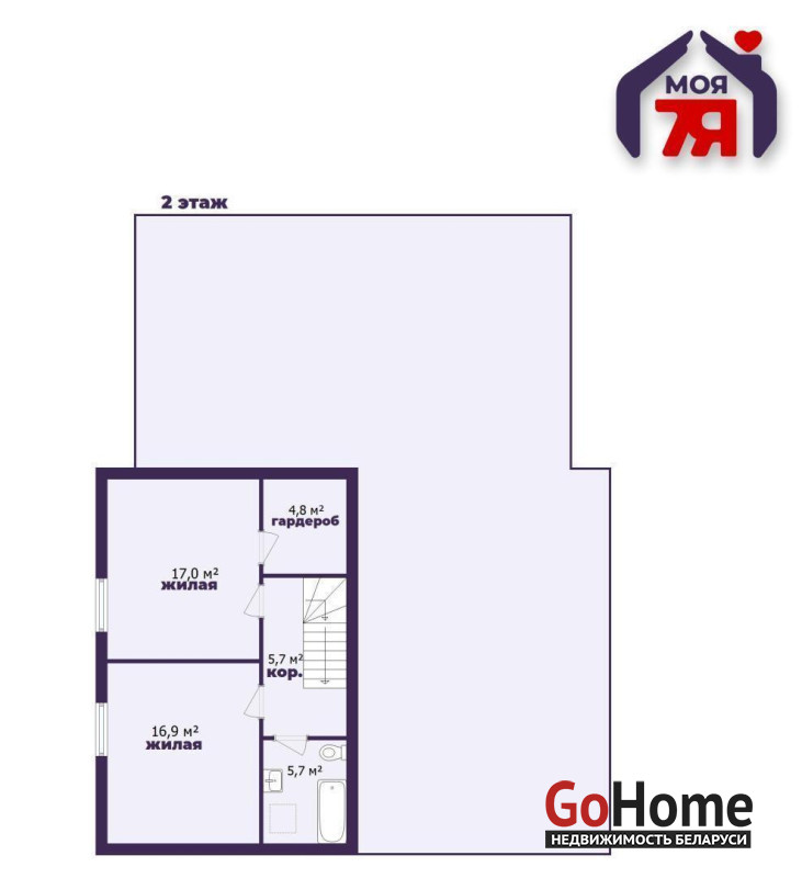 - На 2 этаже: 2 спальные комнаты 17,0 и 16,9 кв.м., одна из которых с гардеробной комнатой 4,8 кв.м., совмещённый санузел 5,7 кв.м.