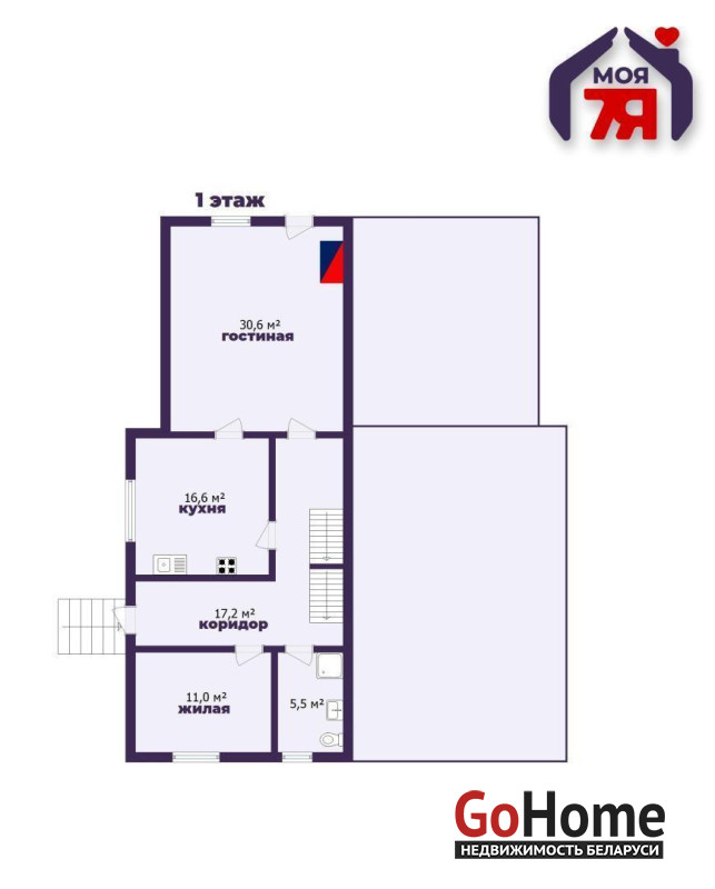 - На 1-ом этаже: гостиная 30,6 кв.м. с дополнительным выходом во двор, просторная кухня 16,6 кв.м., гостевая спальная комната 11 кв.м., просторный совмещённый санузел с душевой 5,5 кв.м.