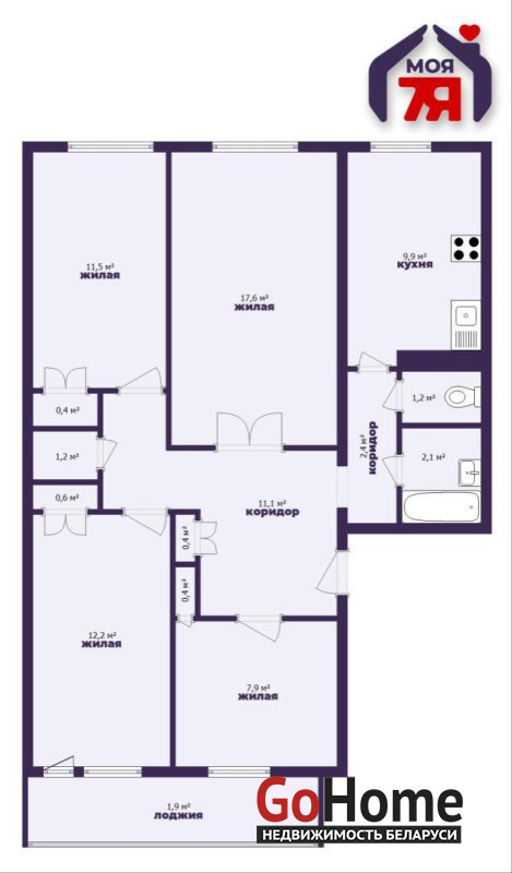 - 4 изолированные жилые комнаты 7,9/11,5/12,2/17,6 кв.м.