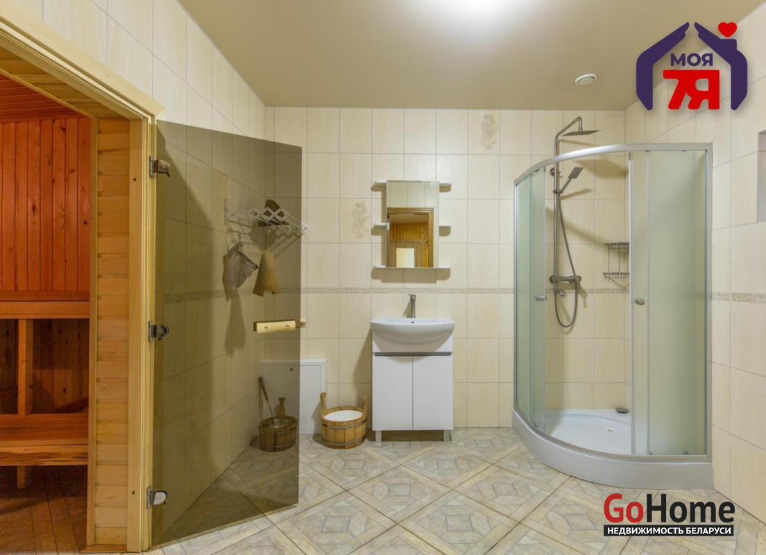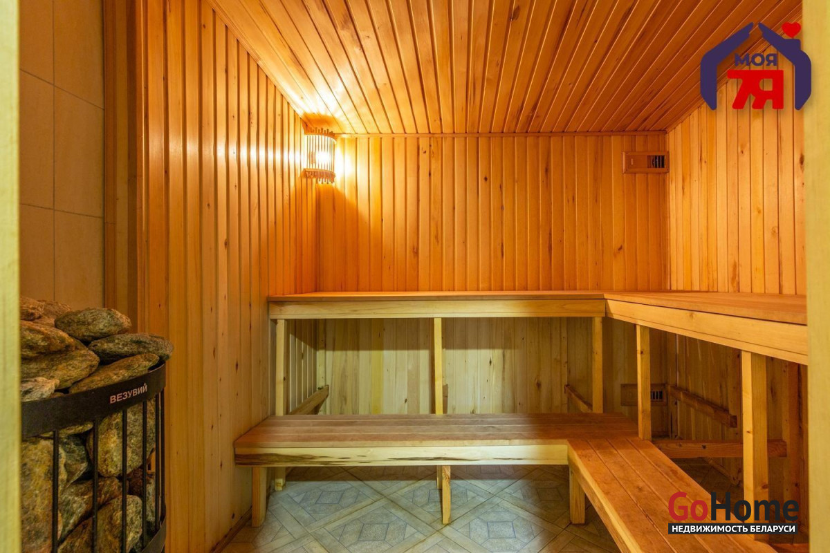 - Банный комплекс площадью 62 кв.м. включает в себя комнату отдыха, помывочную, санузел, парную комнату. Баня на дровах. По полу банного комплекса уложена система теплых водяных полов. Отапливается газовым котлом жилого дома. Рядом с баней предусмотрена зона для барбекю.