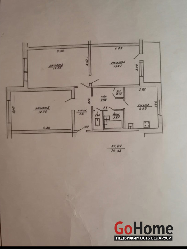 Общей площадью 74.32м2, жилая 51.07м2, кухня просторная 9.59м2.