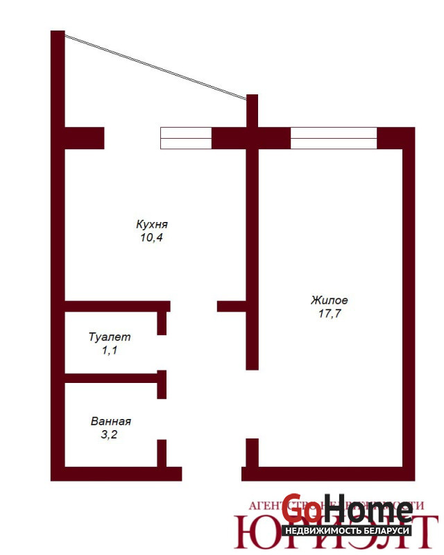 Общая площадь квартиры 39,5 кв.м., жилая - 17,7 кв.м., кухня - 10,4 кв.м.