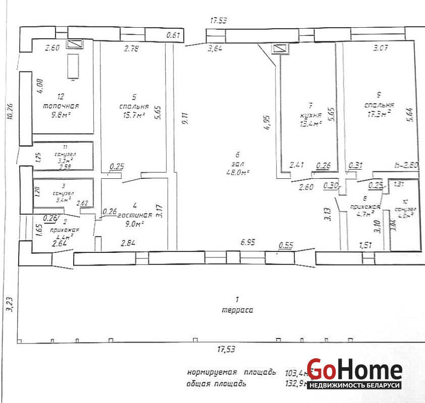 Общая площадь здания – 132,9 кв. м.: нормируемая – 103,4 кв. м.,