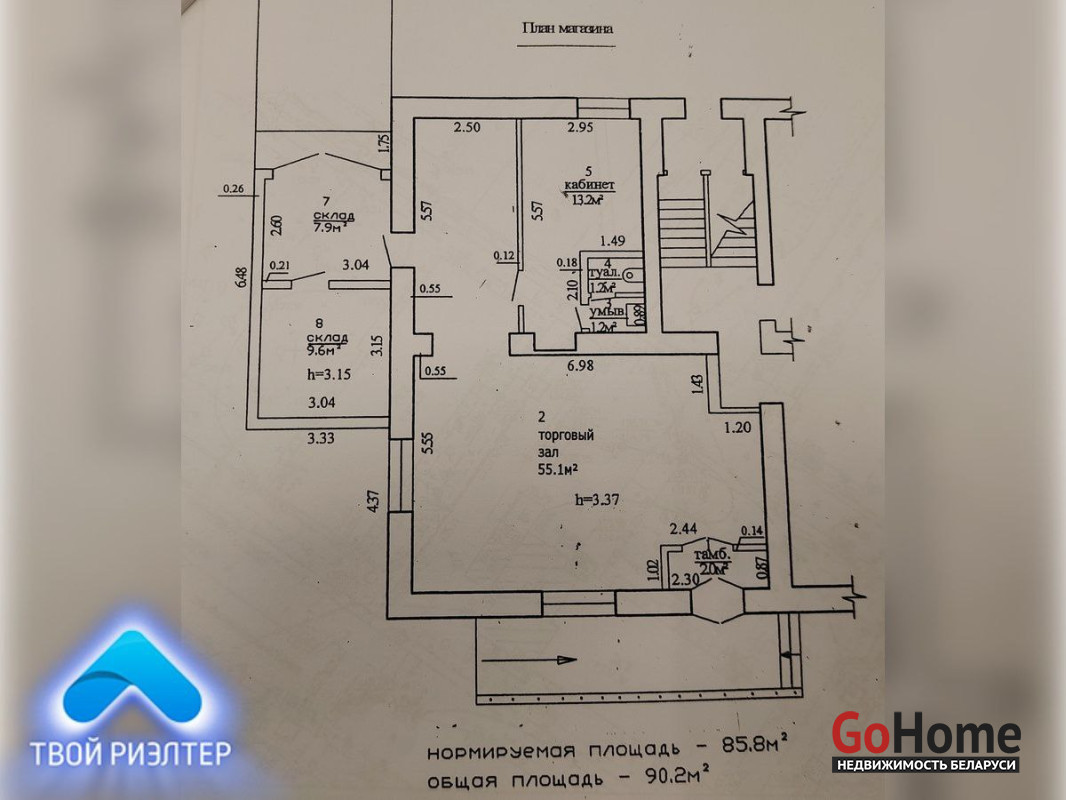 Продается торговое помещение, расположенное по адресу: Гомельская обл., г.Светлогорск, ул.Интернациональная, 4. Помещение расположено на 1 этаже трехэтажного кирпичного жилого дома, площадью 90,2 кв.м. (торговый зал 55,1 м.кв., кабинет 13,2 м.кв., санузел, складское помещение 9,6 и 7,9м.кв.).