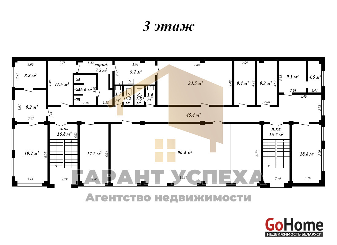 Площадь помещений варьируется от 9 до 90 кв.м, высота - 3,0 м. На каждом этаже общая площадь всех помещений составляет около 335 кв.м.