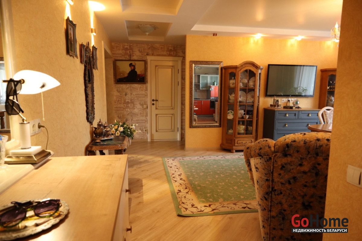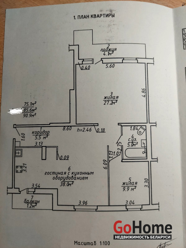 Общая площадь квартиры 85.6 М2, жилая площадь 75.1 М2, кухня совмещена с гостиной, совмещённый санузел.