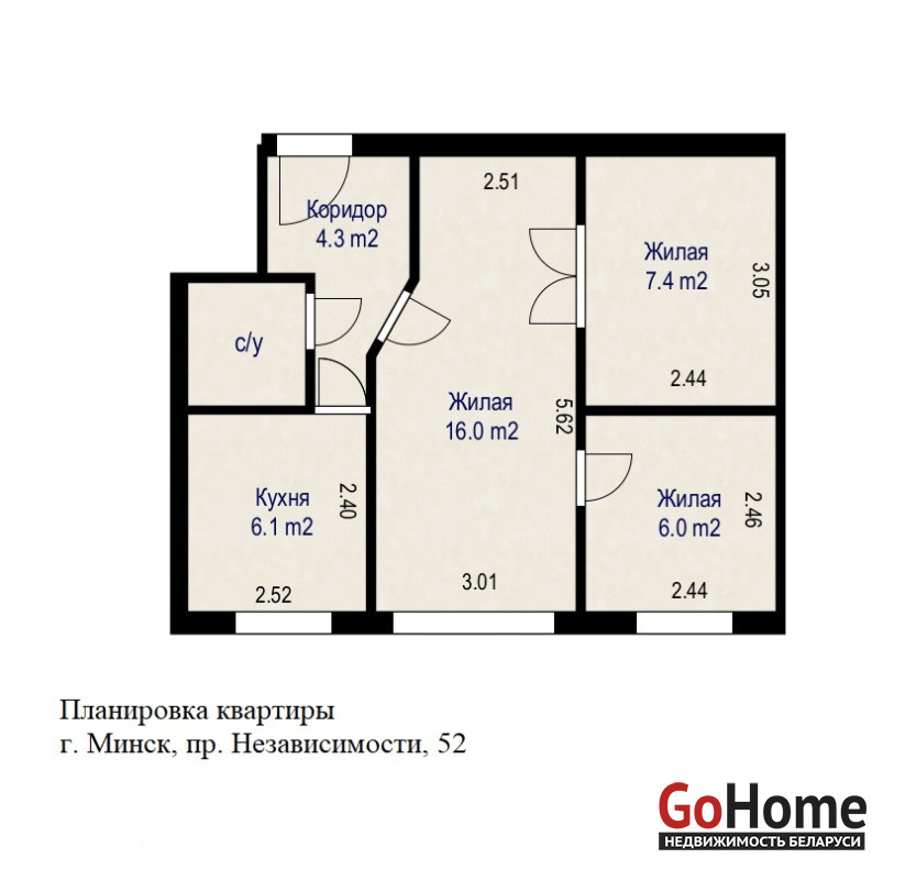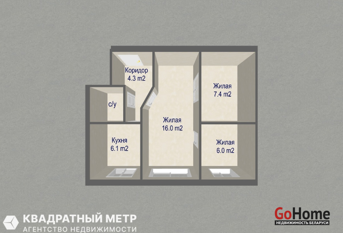 1. Отличная планировка: общая площадь по СНБ – 42,6 м2, жилая площадь 29,4 м2. Комнаты: 16,0 м2, 7,4 м2 и 6,0 м2. Высокие потолки 2,78 м.