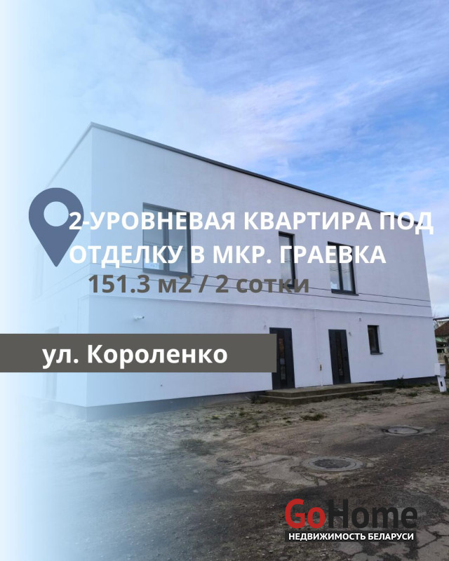 Продается 2-уровневая квартира в блокированном жилом доме под чистовую отделку в г. Бресте, район Граевка, по ул. Короленко. Дом блочный, построенный в 2025 году, состоит из двух этажей и располагается на участке площадью ~ 0,0200 га. Общая площадь квартиры составляет 151,3 кв.м, из которых жилая площадь - 67,5 кв.м, а кухня - 36,5 кв.м. Квартира включает четыре комнаты и два санузла, высота потолков составляет 2,90 м.