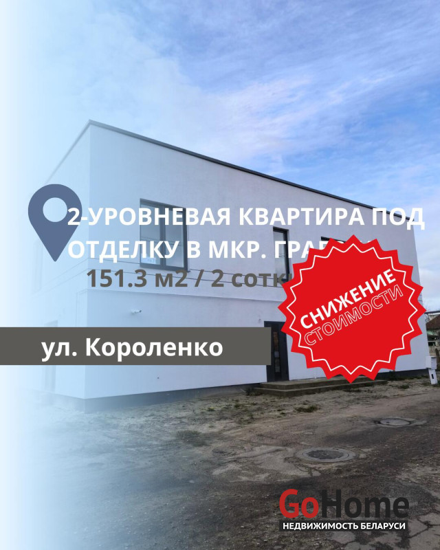 Продается 2-уровневая квартира в блокированном жилом доме под чистовую отделку в г. Бресте, район Граевка, по ул. Короленко (Есть возможность приобрести 2-ю квартиру). Дом блочный, построенный в 2025 году, состоит из двух этажей и располагается на участке площадью ~ 0,0200 га. Общая площадь квартиры составляет 151,3 кв.м, из которых жилая площадь - 67,5 кв.м, а кухня - 36,5 кв.м. Квартира включает четыре комнаты и два санузла, высота потолков составляет 2,90 м.