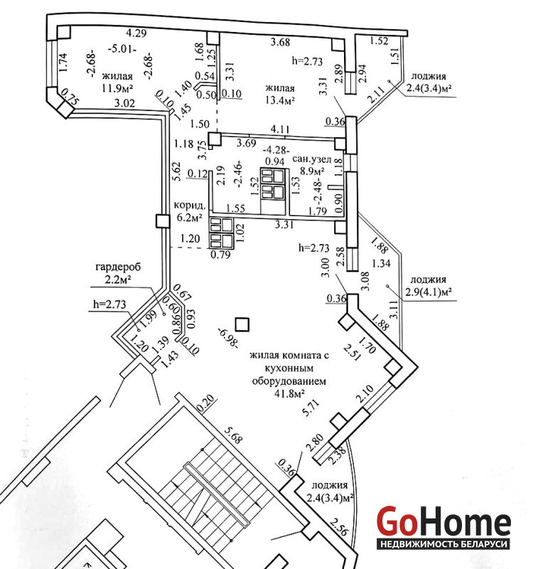 Идеальной планировкой предусмотрено: кухня 41.8 м2 совмещенная с полноценной гостинной и выделенной обеденной зоной, на кухне установлены панорамные окна, спальные комнаты 13.4 м2, 11.9 м2 , сан.узел 8.9 м2.