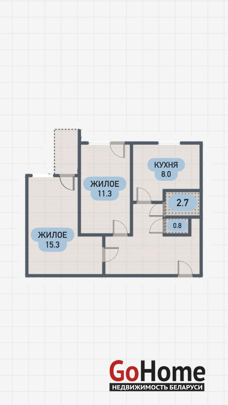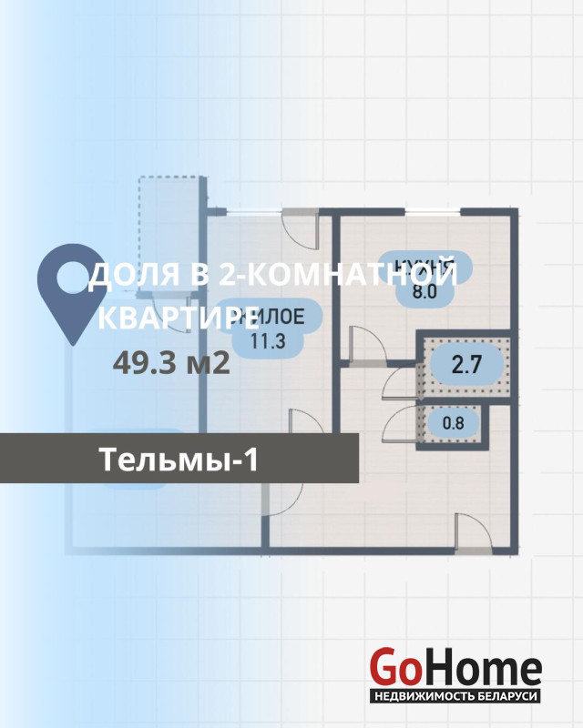 Подписывайтесь на наш instagram @ecrzby для удобного слежения за новыми актуальными объектами.Продается доля (23/40) в 2-комнатной квартире, расположенная в Тельмах-1. Квартира находится на втором этаже трехэтажного кирпичного дома, построенного в 1983 году. Продается большая жилая комната площадью 15,3 м2. Общая площадь квартиры составляет 49,3 м2, кухня имеет площадь 8 м2. Сосед не проживает. В квартире выполнен хороший и аккуратный ремонт, есть лоджия и раздельный санузел.