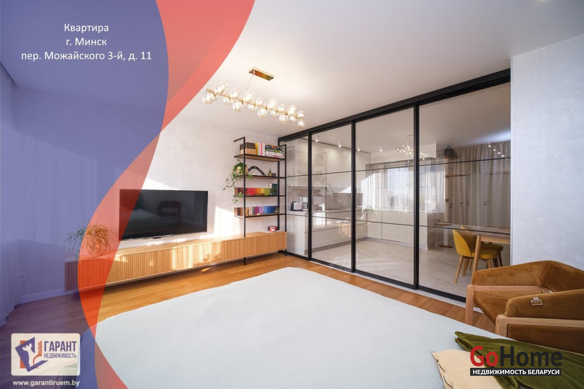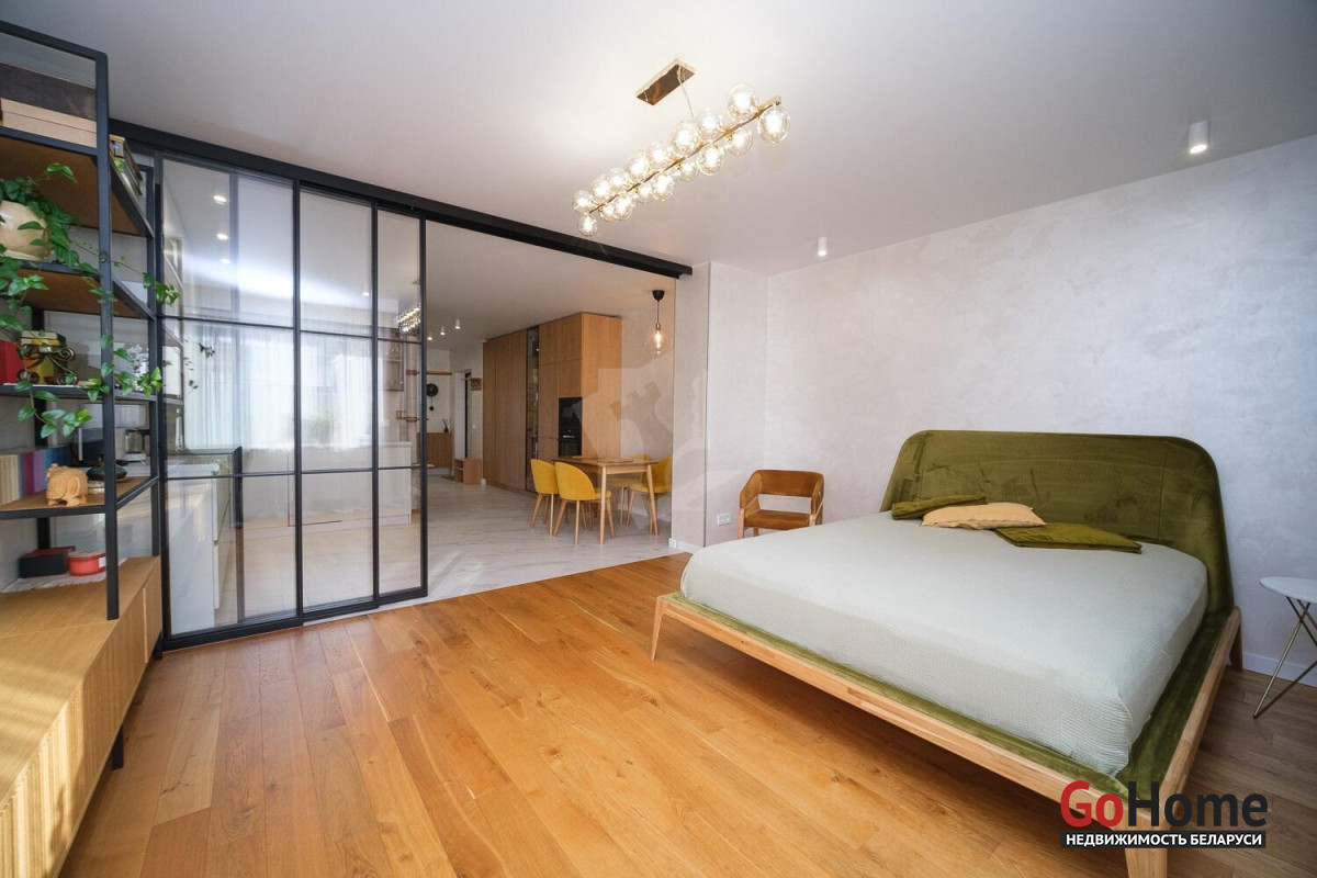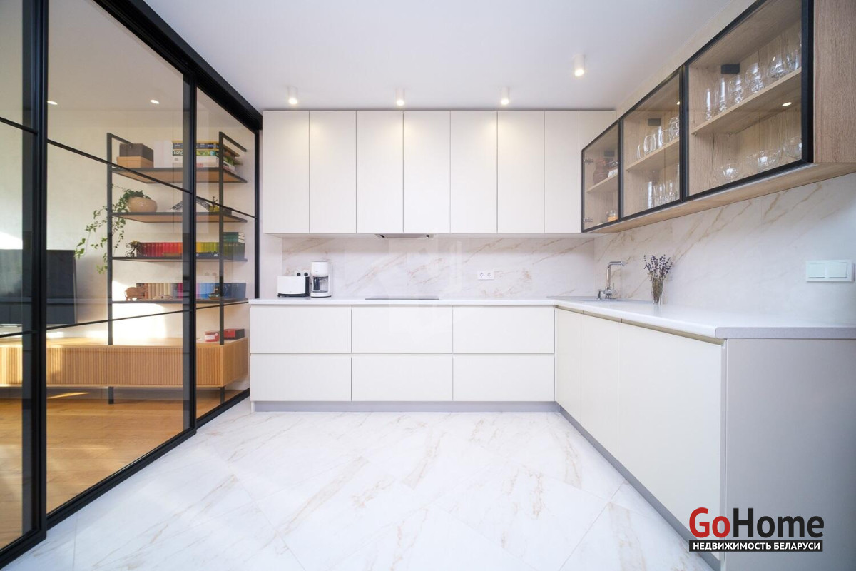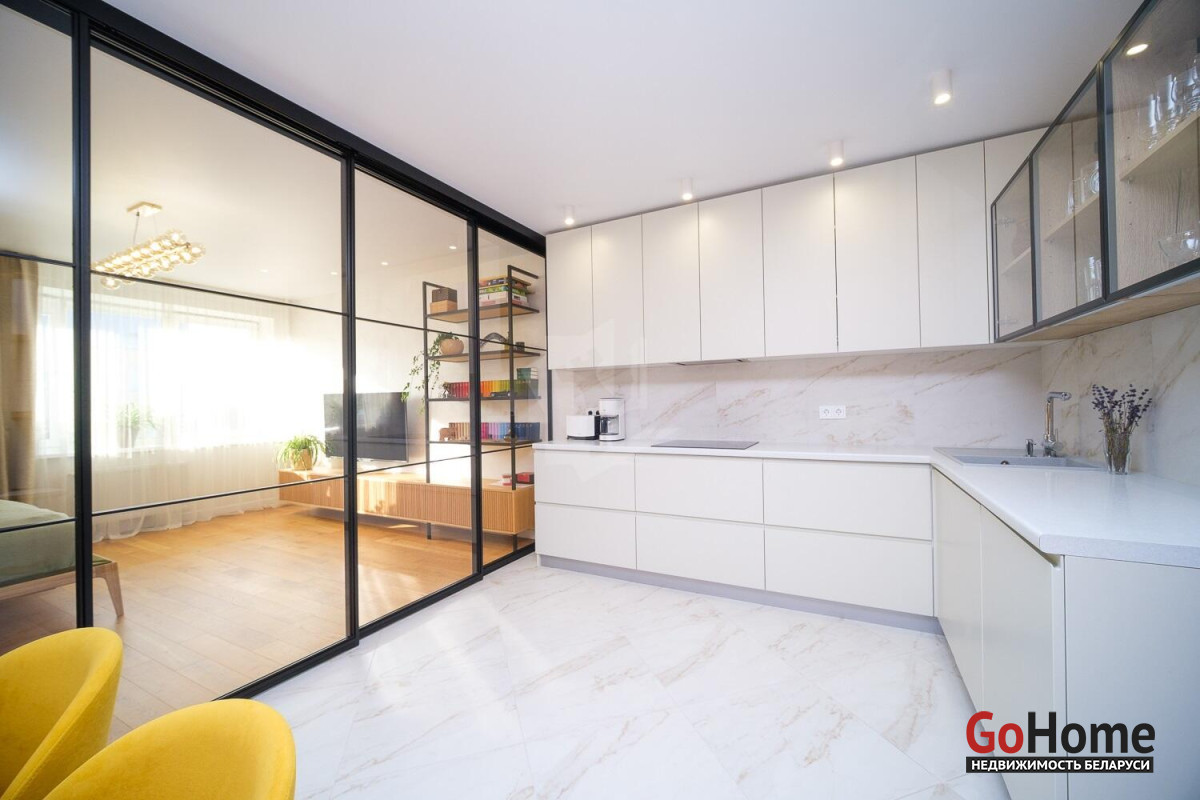 Просторная гостиная объединена с кухней, что создает ощущение простора и свободы, но при этом оборудована стеклянной раздвижной перегородкой, которая не утяжеляет пространство, но при этом даёт возможность для уединения.