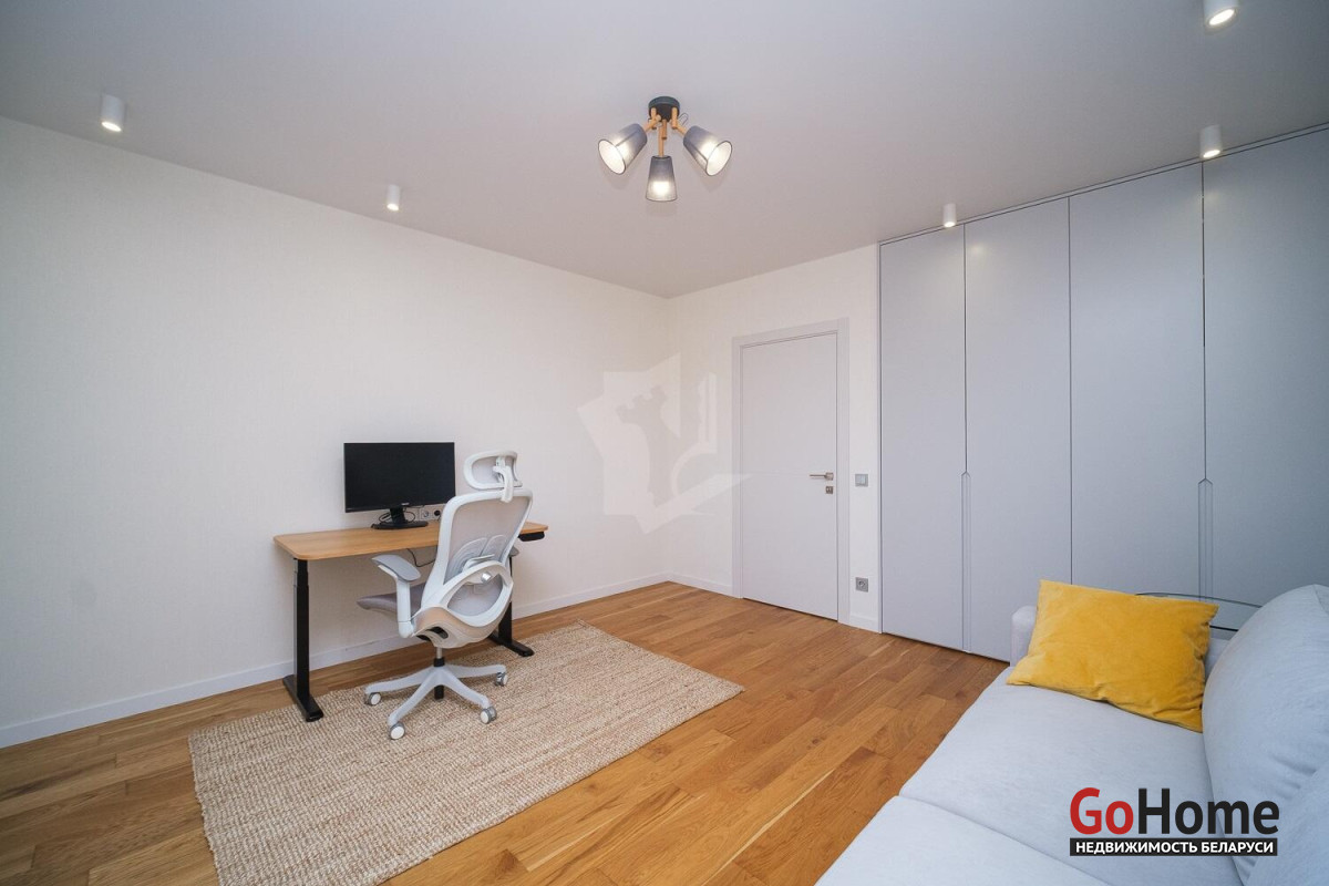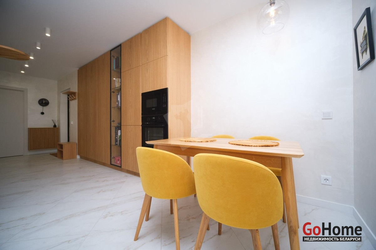 Современный дизайнерский ремонт с использованием качественных материалов. Корпусная мебель из натурального шпона. Пол покрыт паркетной доской из натурального дуба и плиткой.
