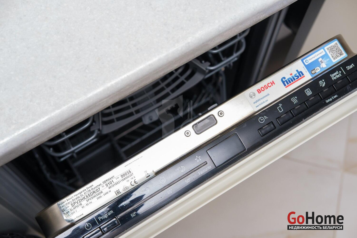Кухня оборудована индукционной плитой Electrolux, духовкой, микроволновой печью Samsung, вытяжкой, посудомоечной машиной Bosch, встроенным холодильником и стиральной машиной Electrolux.