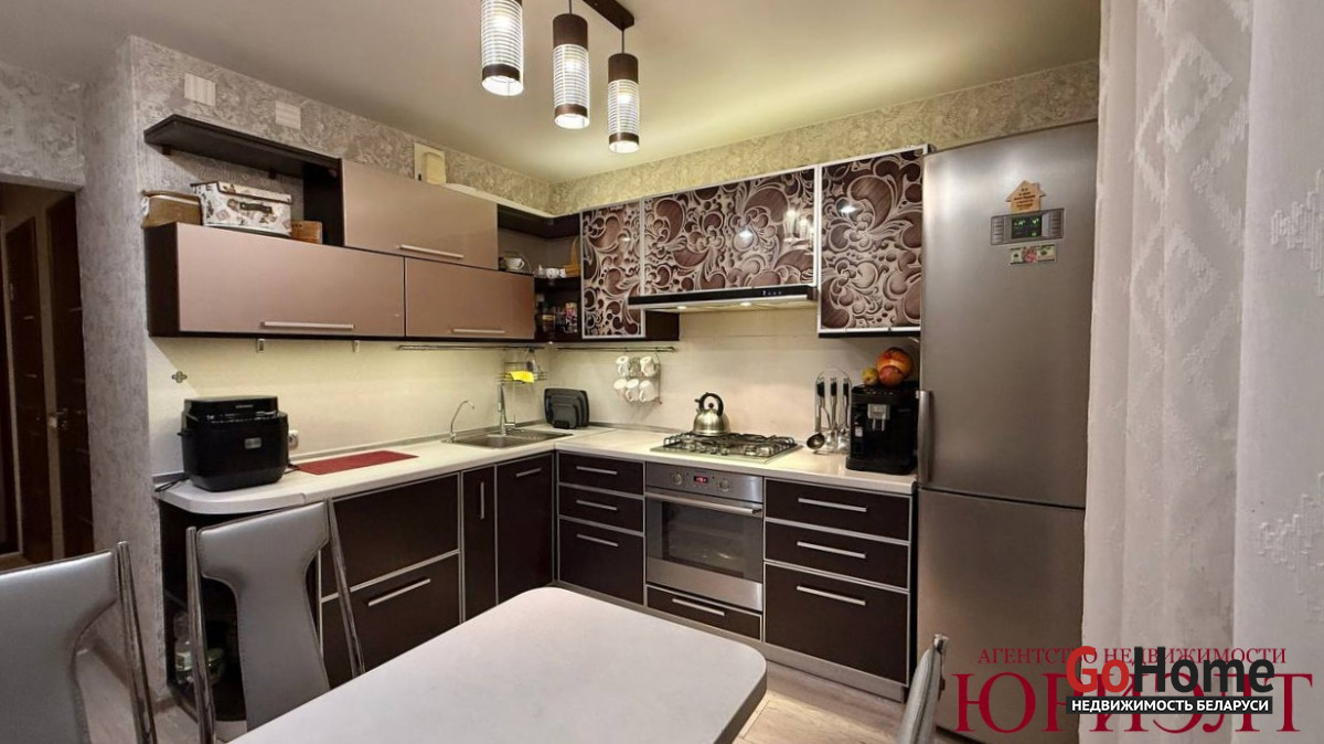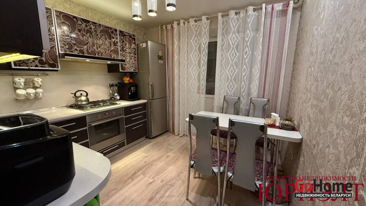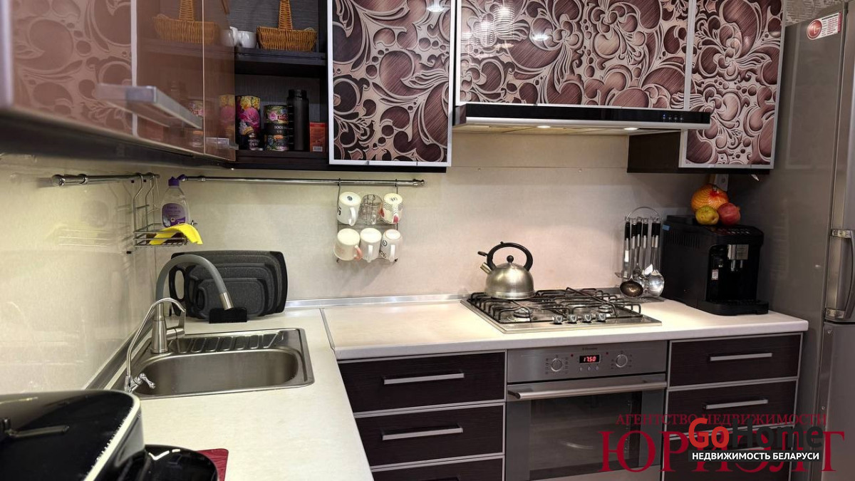 * На кухне встроенная мебель с бытовой техникой;
